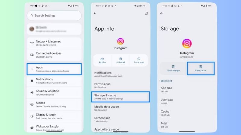 - On Android: Go to Settings → Apps → Instagram → Storage → Clear Cache.