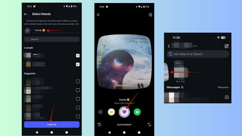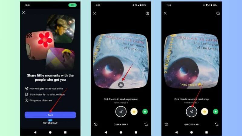 Tap the send button and choose the friend or group you want to share with. You can also create a list of selected contacts for faster sharing. Once sent, the recipient can view the Quicksnap instantly and react with emojis if they like.